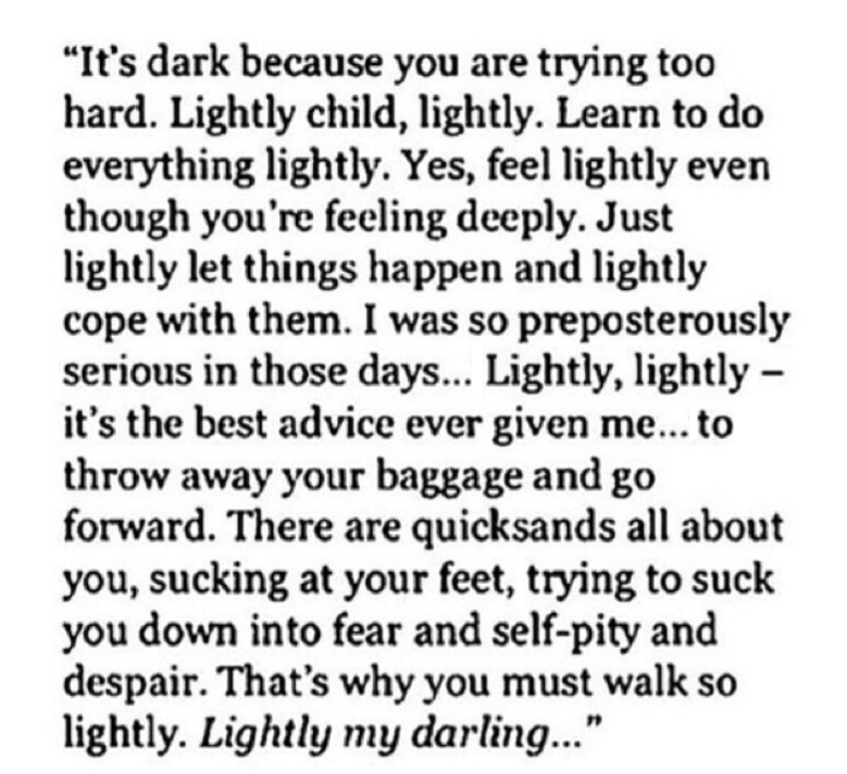 "It's dark because you are trying too hard. Lightly child, lightly. Learn to do everything lightly. Yes, feel lightly even though you're feeling deeply. Just lightly let things happen and lightly cope with them. I was so preposterously serious in those days, such a