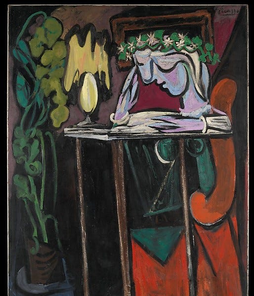 The painting is called Reading at a Table, and it is about exactly that: a woman sitting alone at a table, reading a book by lamplight. Her body seems to morph with the chair, and the book is positioned in a way that it seems to flow into her body, becoming part of her. She has the flowy, strange style of Picasso’s characters, but the strangeness... See more